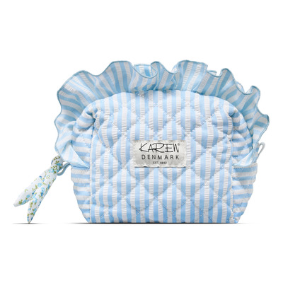 Karen Necessär - Blå/Vit randig är en liten quiltad väska i mjuk bomull med ljusblå och vita ränder. Väskan passar utmärkt för förvaring av smink och mindre produkter och är perfekt för både vardagsbruk och kortare resor. Insidan är fodrad med blommigt tyg. Den försluts med en praktisk dragkedja med en greppvänlig tygrosett.