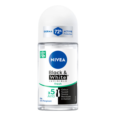 Nivea Black & White Invisible Fresh Deo Roll On skyddar svarta kläder mot vita fläckar och vita kläder mot gula fläckar
