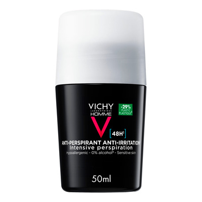 Vichy Homme 48H Anti-Irritations Anti-Perspirant är speciellt utvecklad för män med känslig hud som vill ha en deodorant och antiperspirant med långvarig effekt. Formulan är berikad med Vichy mineraliserande thermalskt vatten som lugnar huden och minskar obehag i upp till 48 timmar. Denna deodorant ger effektivt skydd mot svett och lukt i 48 timmar, är fräsch och mjuk vid applicering och lämnar inga vita märken på huden.