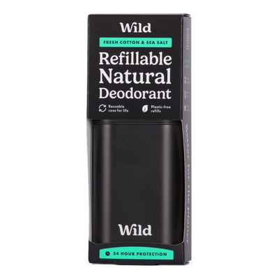 Wild Refillable Natural Deodorant Fresh Cotton & Sea Salt är ett 100% naturligt och återanvändbart startset med deodorant. Förpackningen innehåller ett svart aluminiumfodral och en refill-enhet med doften Fresh Cotton & Sea Salt. Deodoranten är certifierad vegansk och cruelty free. Wild deodorant ger 24-timmars skydd utan att innehålla aluminiumklorid, vilket gör den skonsam mot huden.