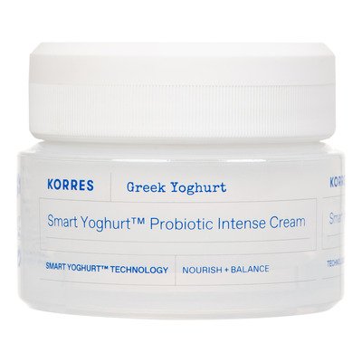 Korres Smart Yoghurt™ Probiotic Intense Cream är en rik fuktighetskräm för daglig vård av torr och känslig hud. Formulan är baserad på Smart Yoghurt™-teknologin, som kombinerar äkta grekisk yoghurt med pre- och probiotiska extrakt, havremjölk och näringsämnen från marina alger. Tekniken är kliniskt bevisad att återställa balansen i hudens mikrobiom och stärka hudbarriären efter en vecka.