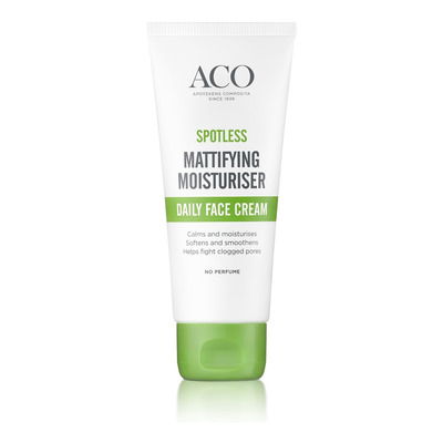 ACO Spotless Daily Face Cream är en återfuktande och mattande gelkräm som har en lugnande effekt på huden. Krämen tillför huden fukt samtidigt som den är oljefri och täpper inte igen porerna. Den absorberar överflödigt fett och lämnar huden matt, len och fräsch.
