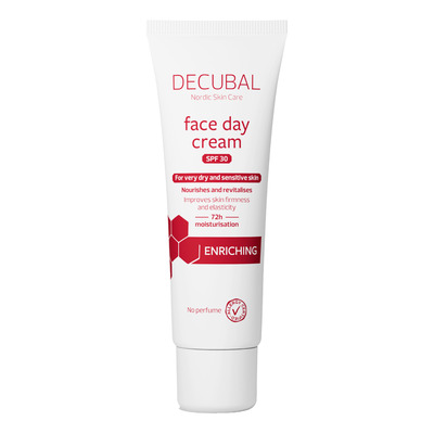 Decubal Enriching Face Cream SPF30 är en närande dagkräm med rik och mjuk konsistens, speciellt framtagen för torr hud. Den innehåller ceramider, kollagen, vitamin C och E samt niacinamid och rödalger som stärker hudbarriären och återfuktar i upp till 72 timmar. Krämen lämnar huden slätare och mer elastisk och är lämplig för känslig hud eftersom den är parfymfri och AllergyCertified.