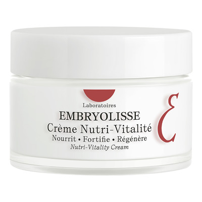 Embryolisse Nutri-Vitality Cream är en extremt närande kräm med krämig konsistens. Krämen förebygger näringsfattig hud, vilket är den vanligaste orsaken till ett mindre ungdomligt utseende. Fuktkrämen innehåller röd lönn framställd av 97% naturliga ingredienser, som ger huden vitaliserande krafter. Den har en naturlig formula speciellt anpassad för känslig hud som har försvagats med åldern.