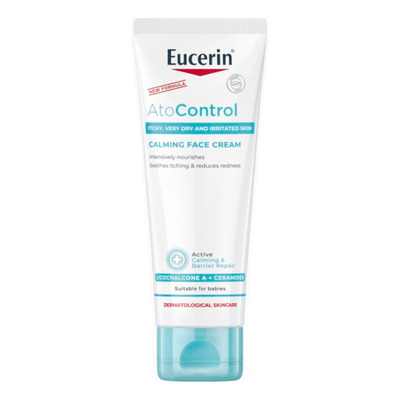 Eucerin AtoControl Calming Face Cream är en närande ansiktskräm avsedd för torr och känslig hud med tendens till klåda, rodnad och stramhet. Den innehåller licochalcone A och ceramider för att lugna huden och stärka hudens naturliga barriär. Konsistensen är lätt och icke-klibbig, vilket gör den lämplig som bas under smink. Krämen kan användas av vuxna och barn från 4 veckor.