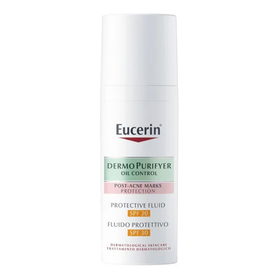 Eucerin DermoPurifyer Protective Fluid SPF30 är en ultralätt dagkräm med 3 nyckeleffekter för daglig vård av fet hud med ärr från orenheter. Den är berikad med bland annat dekandiol som hjälper till att minska ärr och mörka fläckar från orenheter för att ge en mer enhetlig hudton. Dessutom kommer licochalcone A att lugna röd och irriterad hud, samtidigt som en innovativ teknologi håller huden långvarig matt. Eucerin DermoPurifyer Protective Fluid SPF30 har UVA- och UVB-filter för att skydda mot solskador och förvärring av synliga märken från oren hud.