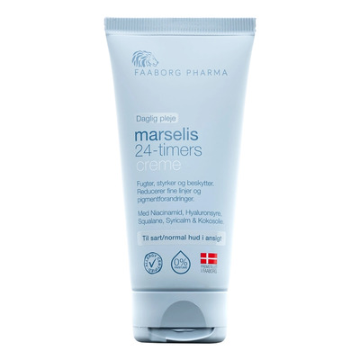 Faaborg Pharma Marselis 24-timers Creme är en återfuktande och lugnande ansiktskräm som vårdar känslig hud dygnet runt. Formulan innehåller niacinamid, som förebygger synliga ålderstecken och jämnar ut pigmentskillnader, samt hyaluronsyra, som hjälper huden att återfå sin naturliga fuktbalans och förbättrar elasticiteten.