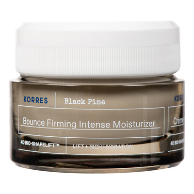 Korres Black Pine 4D Bounce Firming Intense Moisturizer är en avancerad ansiktskräm med 93,7% naturligt innehåll. Den är formulerad med 4D Bio-ShapeLift-teknik, som synligt stramar upp huden och förbättrar ansiktets konturer. Krämen är berikad med extrakt från svarttall, som är rikt på polyfenoler och bidrar till att minska fina linjer och rynkor. Huden blir fastare och slätare.