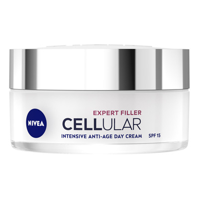 Nivea Cellular Expert Filler Anti-Age Dagkräm SPF15 är en dagkräm som innehåller en kombination av kraftfulla anti-age aktiva ämnen som bekämpar förlust av fasthet och volym i huden. Dagkrämen är berikad med ren folsyra som ger hudcellerna nytt liv och hyaluronsyra som bidrar till att fylla ut rynkor, släta ut och återfukta huden. SPF 15 ger UVA- och UVB-skydd för att förebygga tidiga ålderstecken.