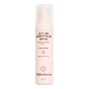 ALT I EN BESKYTTELSE 30 SPF från Pudderdåserne är en färgad dagkräm med SPF 30 som innehåller 100% mineraliska solfilter. Solfiltren har ett högt och brett spektrum skydd mot solens skadliga UV-strålar, eftersom det reflekterar strålarna bort från huden och därmed minskar hudirritation. ALT I EN BESKYTTELSE SPF 30 innehåller bland annat hyaluronsyra och vitamin C och har ingen tillsatt parfym. Den har ett högt skydd mot blått ljus, UVA, UVB och infraröda strålar. Produkten kan användas ensam som solskydd, men eftersom konsistensen är lätt och torr kan den också användas ovanpå en annan kräm.