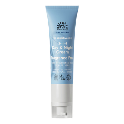 Urtekram Fragrance Free 2in1 Day & Night Cream är ekologiskt certifierad av Ecocert COSMOS Organic och AllergyCertified, vilket gör den lämplig för alla hudtyper. Den är vegansk och producerad i Danmark med ingredienser av 100% naturligt ursprung. Formulan är parfymfri, vilket gör den idealisk för daglig vård av känslig hud.