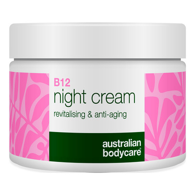 Australian Bodycare B12 Night Cream är en närande nattkräm som reducerar fina linjer, förbättrar hudens elasticitet och ger intensiv återfuktning. Den innehåller vitamin B12, som stärker och lugnar huden, och bakuchiol, en naturlig antioxidant som stimulerar kollagenproduktionen och ger en fastare hud. Hyaluronsyra återfuktar i upp till 8 timmar, medan squalane och niacinamid jämnar ut hudtonen och förebygger irritation.