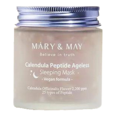 Mary&May Calendula Peptide Ageless Sleeping Mask är en vegansk sovmask som återfuktar och ger näring till huden medan du sover. Masken är berikad med extrakt från ringblomma som har antiinflammatoriska egenskaper som lugnar irriterad hud och minskar rodnad. Dessutom skyddar antioxidanterna i ringblomma huden från att åldras i förtid. Produkten innehåller 25 olika typer av peptider som stimulerar hudens kollagenproduktion, vilket bidrar till att reducera fina linjer och ger huden en fastare och mjukare textur.