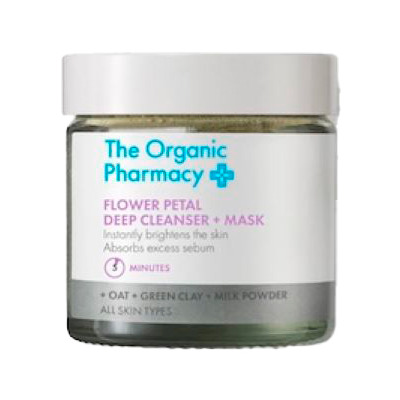 The Organic Pharmacy Flower Petal Deep Cleanser + Mask är en rengörande och uppfriskande ansiktsmask i pulverform. Den kombinerar havre, grön lera och mjölkpulver för att varsamt exfoliera, absorbera överflödigt fett och göra huden ljusare. Grön lera fungerar som en magnet för orenheter, medan havre lugnar och skyddar huden utan att irritera.