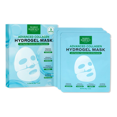 Mario Badescu Advanced Collagen Hydrogel Sheet Mask är en intensiv engångsmask med 20+ aktiva ingredienser. Den är formulerad med 6 peptider och 8 former av hyaluronsyra, som arbetar på djupet för att återfukta huden och reducera fina linjer. Kollagen och 3% niacinamid förbättrar hudens elasticitet och jämnar ut hudtonen, medan fermenterade och lugnande ingredienser som cica och grönt te stärker hudbarriären.