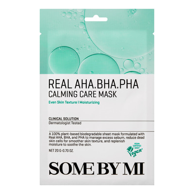 Some By Mi Real AHA BHA PHA Calming Care Mask är en lugnande sheet mask som effektivt exfolierar huden med fruktsyrorna AHA, BHA och PHA. Masken avlägsnar döda hudceller, smuts och överflödigt sebum, vilket minskar uppkomsten av stora porer och orenheter. De exfolierande syrorna främjar cellförnyelsen och hjälper till att minska åldersfläckar, akneärr och solskador. Masken ingår i Some By Mi's Real-linje och är tillverkad av 100% växtbaserad cellulosa för en skonsam behandling. Den är också dermatologiskt testad och lämplig för fet och oren hud.