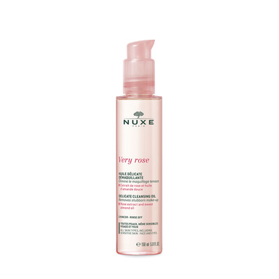 Nuxe Very Rose Delicate Cleansing Oil är en mild rengöringsolja som avlägsnar även vattenfast makeup från både ansikte och ögon. Oljan innehåller 95% naturliga ingredienser, bland annat rosenvatten som återfuktar och lugnar huden samt sötmandelolja som skyddar och ger näring. Rengöringsoljan rengör effektivt utan att störa hudens naturliga balans eller lämna en fet känsla. Den milda doften av ros ger en behaglig upplevelse vid användning.