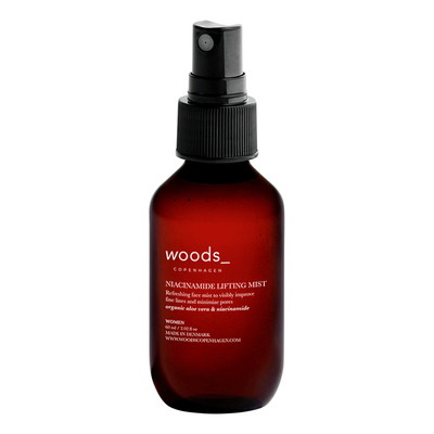 Woods Copenhagen Niacinamide Lifting Mist är en multifunktionell ansiktsmist som återfuktar och hjälper till att stärka hudens barriärfunktion. Den innehåller 5% niacinamid (vitamin B3), som bidrar till att minska synligheten av porer, jämna ut hudtonen och förbättra hudens elasticitet. Sprayens sammansättning gör den lämplig för daglig användning eller när huden behöver en snabb uppfriskande boost. Sprayen är vegansk.