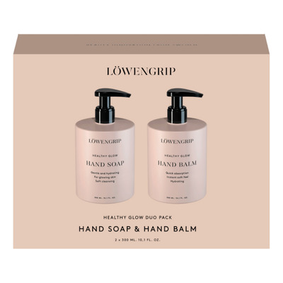 Löwengrip Healthy Glow Duo innehåller två produkter: Healthy Glow Hand Soap (300 ml) och Healthy Glow Hand Balm (300 ml). Handtvålen är mild och återfuktande och är framtagen för att ge huden en fräsch lyster. Den löddrar upp och rengör händerna skonsamt med en doft av honung och mysk.