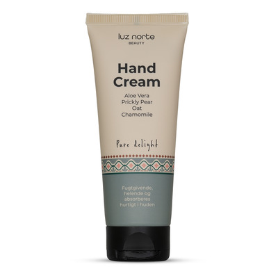 Luz Norte Hand Cream ger intensiv vård för torra händer med en mild formula baserad på ekologisk aloe vera. Den innehåller glycerin, sheasmör och växtoljor som kaktusfikon, jojoba och mandel som återfuktar, ger näring och stärker hudens naturliga barriär. Kamomill och havre har en lugnande effekt och hjälper till att lindra irritation och rodnad. Konsistensen är lätt och icke-fet.