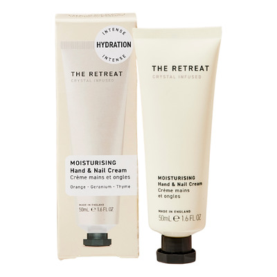 The Retreat Moisturising Hand & Nail Cream är en 97% naturlig hand- och nagelkräm med en rik men icke-fet konsistens. Formulan innehåller sheasmör och solrosolja som mjukgör och skyddar huden, samt kamomillextrakt som lugnar. Krämen är certifierad av Ecocert Greenlife, vegansk och dermatologiskt testad för alla hudtyper.