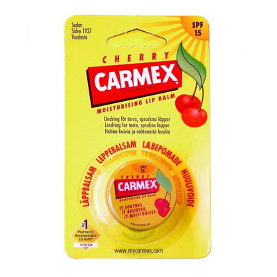 Carmex Cherry Lip Balm är ett läppbalsam med en läcker körsbärsdoft. Läppbalsamet innehåller solskyddsfaktor 15 som skyddar läpparna från solen och förhindrar solbränna vid regelbunden användning. Idealiskt för dagligt bruk både vinter och sommar. Läppbalsamet håller läpparna återfuktade under lång tid tack vare dess innehåll av vaselin. Dessutom innehåller den även lanolin, kakaosmör, bivax och salicylsyra som återfuktar, mjukgör och skyddar läpparna. Läppbalsamet innehåller mentol och kamfer som har en kylande effekt på läpparna.