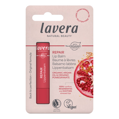 Lavera's Repair är baserad på helt naturliga och ekologiska ingredienser som har en regenererande effekt på cellerna för att hålla huden förnyad och frisk. Dessa egenskaper får den från granatäpple, som är superrikt på näringsämnen och naturliga aktiva ingredienser. Läppbalmen innehåller också arganolja som mättar de djupa lagren, håller läpparna återfuktade och förhindrar nare och sprickor.