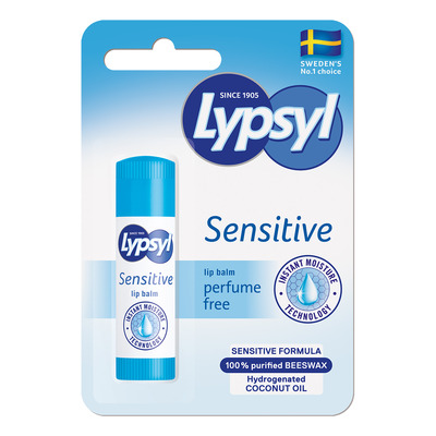 Lypsyl Sensitive Lip Balm är ett läppbalsam som skyddar och vårdar torra, spruckna läppar. Det innehåller hydrerad kokosolja och 100% rent bivax som hjälper till att bibehålla läpparnas fuktbalans och motverkar torrhet. Läppbalsamet är dermatologiskt testat, vilket gör det idealiskt för personer med känslig hud.