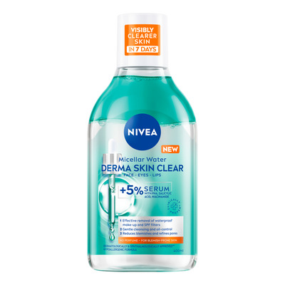 Nivea Derma Skin Clear Serum-Infused Micellar Water rengör huden skonsamt och avlägsnar smink, smuts och SPF