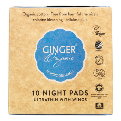Ginger Organics ekologiska binda, både dag- och nattbinda är inte bara tillverkade i 100% ekologisk bomull, utan också 100% biologiskt nedbrytbara.