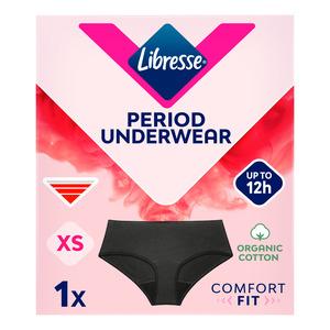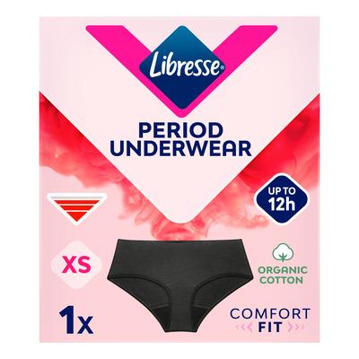Libresse Menstrual Panty Hipster Black XS har en tunn ComfortFit-midja, skräddarsydd för denna lilla storlek. Perfekt för XS användare och finns även i storlekarna S, M, L och XL. Trosan kan tvättas och återanvändas upp till 50 gånger utan att förlora form eller funktion. Ett hållbart alternativ till engångsprodukter.
