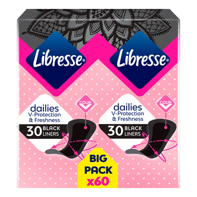 Libresse Black Daily Fresh trosskydd är utformade för att ge dig ett osynligt, bekvämt och säkert skydd i vardagen - perfekt för användning med mörka underkläder. Den svarta färgen gör inlägget nästan osynligt, samtidigt som det håller samma höga kvalitet och komfort som du känner igen från Libresse.