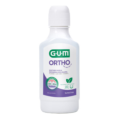 Gum Ortho Mouthwash är speciellt utvecklad för personer med ortodontisk behandling. Det innehåller 400 ppm fluor och isomalt som bidrar till att skydda emaljen och förebygga hål i tänderna. Cetylpyridiniumklorid förhindrar plackbildning och antiinflammatoriska ingredienser som aloe vera, ingefära och bisabolol lugnar munslemhinnan.