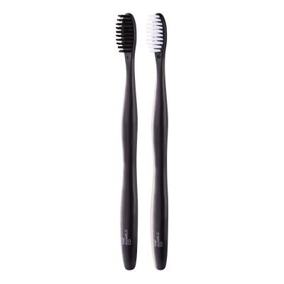 The Humble Co. Plant-based Toothbrush Soft är ett paket med två tandborstar i svart och vitt med mediummjuka borst. Borstarnas skaft är tillverkade av växtbaserade material, inklusive vetestärkelse, och innehåller upp till 45% mindre fossil plast. Borsten är tillverkade av BPA-fri nylon och består av 65% växtbaserade material från ricinusbönor.
