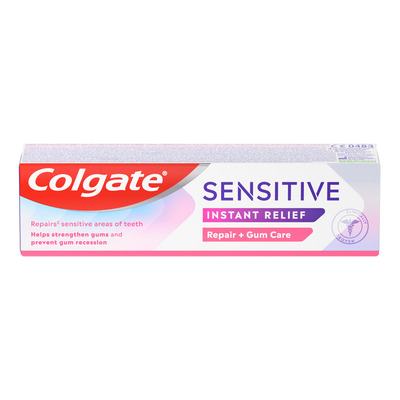 Colgate Sensitive Instant Relief Repair + Gum Care tandkräm lindrar omedelbart ilning och bidrar till att stärka tandköttet. Tandkrämen förebygger tandköttsfickor och bygger med tiden upp en skyddande barriär som tätar och förhindrar att ilning återkommer. Den kliniskt beprövade Pro-Argin-tekniken stänger exponerade dentinkanaler som orsakar isbildning.