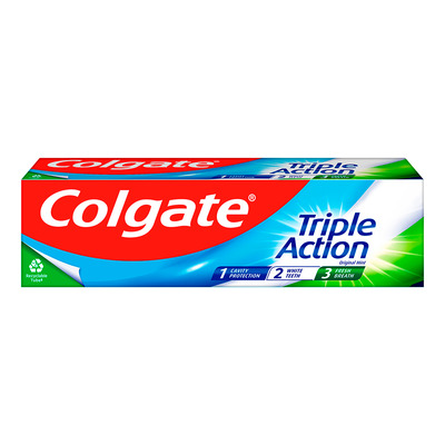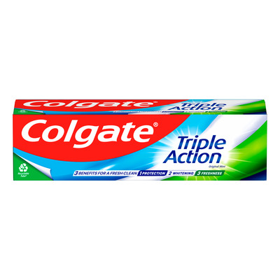 Den kombinerar effektivt skydd från fluor med en behaglig borstningsupplevelse och lämnar munnen ren och fräsch. Colgate Triple Action Tandkräm är idealisk för hela familjen eftersom den ger omfattande tandvård vid varje borstning. Använd den dagligen för friska, vita tänder och frisk andedräkt.