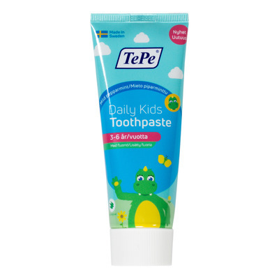 TePe Daily Kids Tandkräm är en mild fluortandkräm speciellt utvecklad för barn i åldern 3-6 år. Tandkrämen innehåller noggrant utvalda ingredienser och är framtagen i samarbete med tandläkarexperter. Den har en åldersanpassad fluorhalt på 1000 ppm som hjälper till att förebygga karies.
