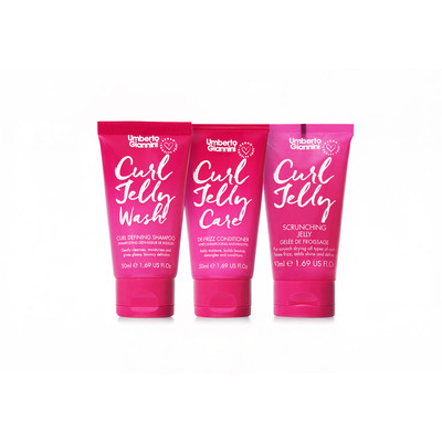 Umberto Giannini Curl Jelly Starter Kit innehåller de tre bästsäljande produkterna från Curl Jelly-serien i resestorlek: Curl Jelly Wash Shampoo, Curl Jelly Care Conditioner och Curl Jelly Scrunching Jelly. Kitet är lämpligt för att testa sortimentet eller som resekit.