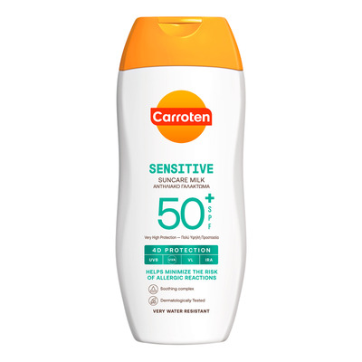 Carroten Sensitive Milk SPF 50+ är speciellt framtagen för känslig hud och ger ett avancerat 4D-skydd mot UVB-, UVA-, VL- och IRA-strålar. Den milda, parfymfria formulan hjälper till att skydda huden mot solens skadliga effekter, medan hyaluronsyra ger intensiv återfuktning och hjälper till att bibehålla hudens naturliga fuktbalans.