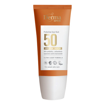 Derma Supreme Sun Fluid Face SPF50 är berikad med prebiotika, niacinamid, hyaluronsyra, E-vitamin och mikroalger. Dessa ingredienser skyddar huden, förbättrar hudens struktur och ger en jämnare hudton. Solkrämen är parfymfri, Svanenmärkt, allergimärkt och certifierad vegansk.