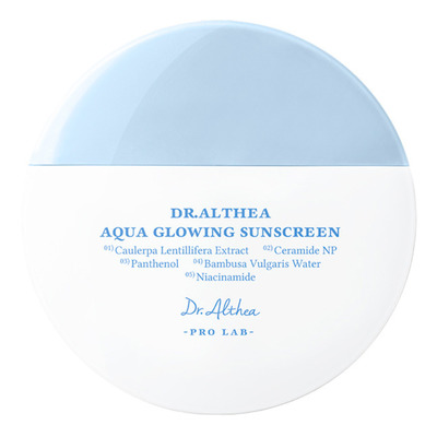 Dr. Althea Aqua Glowing Sunscreen är en vegansk solkräm med SPF 50+ PA++++ som skyddar mot både UVA- och UVB-strålar. Den lätta och snabbabsorberande konsistensen gör den lämplig för daglig användning utan att huden känns fet. Solskyddet är berikat med bambuvatten och panthenol för intensiv återfuktning, medan ceramid NP och niacinamid bidrar till att stärka hudens naturliga barriär. Formuleringen innehåller också extrakt från grönalger (Caulerpa Lentillifera) som tillför antioxidanter och bidrar till en jämnare hudton.