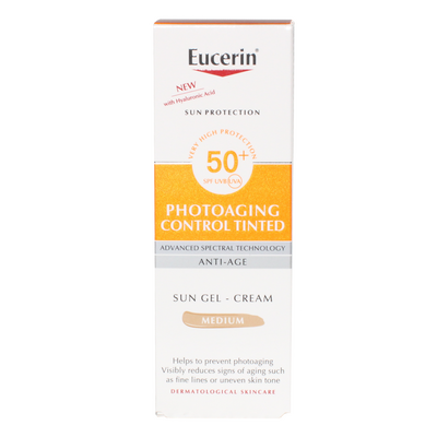 Eucerin Photoaging Control Tinted Sun Gel-Cream SPF50 + är en färgad solkräm för ansiktet, som med sina noggrant utvalda ingredienser minskar fina linjer i huden och ger en mer enhetlig hudton. Den är bland annat berikad med hyaluronsyra som har en fuktbindande effekt för att förhindra uppkomsten av rynkor och för att säkerställa att din hud inte torkar ut. En annan nyckelingrediens i detta färgade solskydd är Licochalcone A, som skyddar huden från fria radikaler och UV-strålar. Du får ett högt solskydd varje dag, eftersom Eucerin Photoaging Control Tinted Sun Gel-Cream SPF50 + kombinerar bredspektrum samt fotostabila UVA- och UVB-filter.