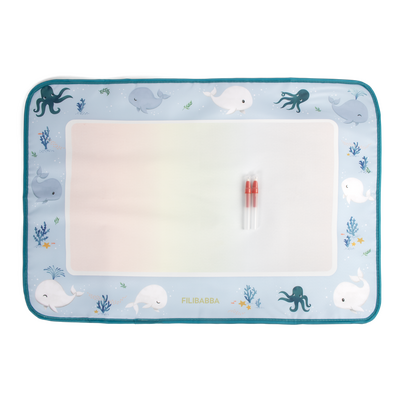 Med Filibabba Vattenritmatta kan barnen rita och måla med vatten - färgerna blommar ut när mattan blir våt och försvinner igen när den torkar. Inga färger eller tuschpennor behövs. Setet innehåller två påfyllningsbara vattenfärgspennor och kan användas om och om igen.