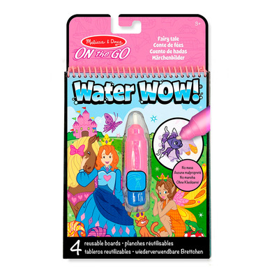 Melissa and Doug Water Wow Äventyr är en kreativ målarbok med åtta återanvändbara sidor och en medföljande vattenpenna. När barnen målar med vatten avslöjas färgstarka scener med prinsessor, slott och älvor. När sidorna torkar återfår de sitt ursprungliga utseende och kan användas om och om igen. Den speciella röda linsen avslöjar dolda detaljer och ger extra spänning åt leken.