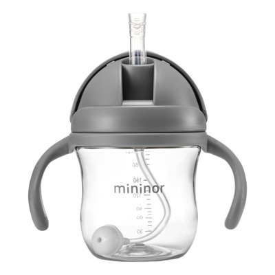 Mininor sugrörsmugg grå är en lättanvänd och droppfri mugg för små barn. Sugröret i koppen är mycket mjukt och har en tung kula längst ner som säkerställer att sugrörets ände följer vätskan. Detta gör att barnet kan ligga ner och ändå få vätskan. De mjuka handtagen gör koppen lätt att hålla i och locket kan enkelt öppnas och stängas av barnet. Muggen är tillverkad av BPA-fritt material och rymmer 220 ml vätska. Den är lämplig för alla typer av drycker, t.ex. vatten, juice och mjölk, men bör inte användas för varma drycker.