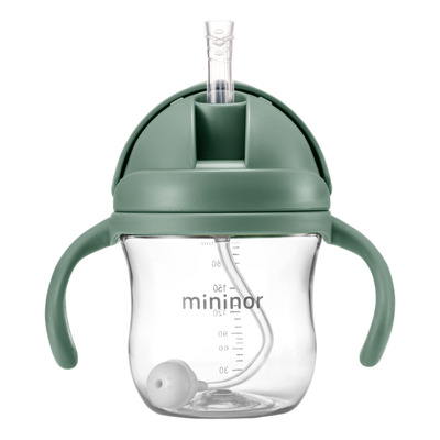 Mininor sugrörsmugg grön är en lättanvänd och droppfri mugg för små barn. Sugröret i koppen är mycket mjukt och har en tung kula längst ner som säkerställer att sugrörets ände följer vätskan. Detta gör att barnet kan ligga ner och ändå få vätskan. De mjuka handtagen gör koppen lätt att hålla i och locket kan enkelt öppnas och stängas av barnet. Muggen är tillverkad av BPA-fritt material och rymmer 220 ml vätska. Den är lämplig för alla typer av drycker, t.ex. vatten, juice och mjölk, men bör inte användas för varma drycker.