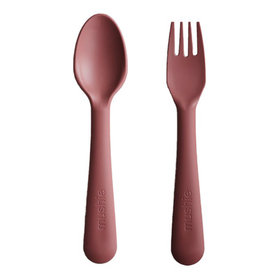 Mushie Gaffel & Sked i färgen Woodchuck - praktiska och snygga barnbestick
