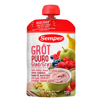 Semper Fruktgröt med äpple, hallon & blåbär för barn från 6 månader är ett fruktigt och mättande mellanmål som passar perfekt för aktiva småbarn. Den ätfärdiga gröten kombinerar de fräscha och söta smakerna av äpple, hallon och blåbär, vilket gör den både mättande och god som mellanmål. Gröten är rik på viktiga näringsämnen som järn, kalcium och C-vitamin och bidrar till barnets sunda tillväxt och utveckling.