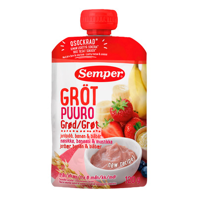 Semper Fruktgröt med jordgubbar, bananer och blåbär 6 månader är en näringsrik och praktisk lösning för hektiska dagar