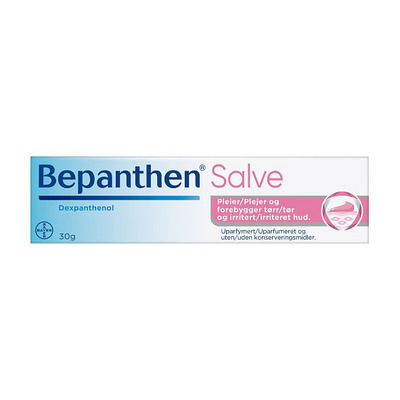 Bepanthen salva innehåller dexpantenol som stödjer hudens egna naturliga läkningsprocess genom att tränga in i huden och omvandlas till vitamin B5. Vitamin B5 främjar skapandet av nya hudceller och bygger därmed upp huden naturligt från insidan.